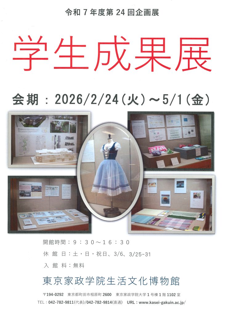 令和7年度第24回企画展「学生成果展」が開催いたしました。 これは、学生の卒業制作・研究、授業での作品、地域連携報告などの成果を公開する企画です。今回は、現代生活学部より生活デザイン学科から建築模型、バレエ衣装、創作衣装、織物のランチョンマットやショール、マット、バッグ、また加工を施した生地を使ったクッション、バッグ、ヘッドレスト、ワンピースなどを、食物学科から企業連携による食品開発などの報告を展示しました。人間栄養学部より人間栄養学科からレシピ本を、また活動報告書や発表用パワーポイント原稿を展示しました。ぜひご覧ください。