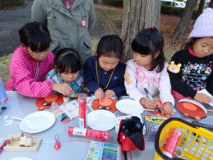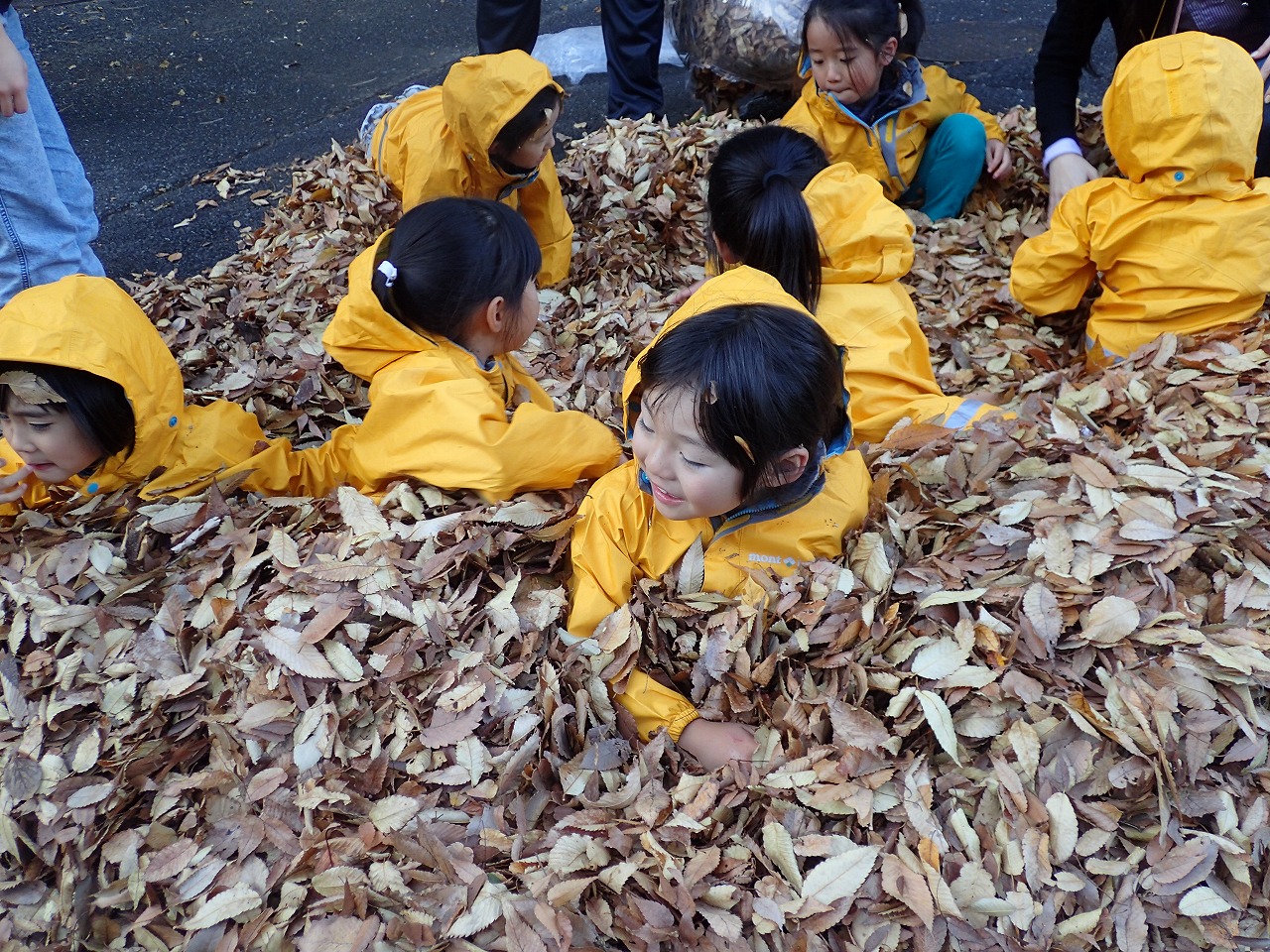 2014.12.01 学科情報 第5回森のようちえんについて HOME ニュース 学科情報 第5回森のようちえんについて 今回の森のようちえんは、大学生と一緒に鬼ごっこです。40人の学生を相手に子ども達は学内のゴルフ場の中で追いかけたり、逃げ回ったりでとっても楽しそ うでした。その後は落ち葉でかくれんぼ、葉っぱのにおいと、虫になった気分はどうだったでしょう。最後はドングリで作ったデンデン太鼓の製作、たぬきのお なかのようにポンポコ鳴ったかな?次回は12月6日です。 ■森のようちえんについて(過去の「森のようちえん活動報告」もご覧いただけます)