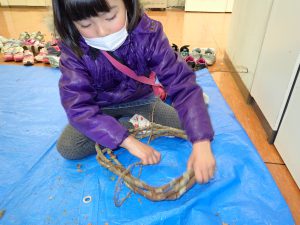 今日はまた新しいお友達が参加してくれました。まだ年少さんですが、お姉ちゃん達と一緒に元気に活動していました。ツタは去年たくさん採り過ぎたせいか今年の収穫は少なかったです。でもみんなしっかりときれいなリースができました。サンタさんの目印になるようにたくさんオーナメントを付けてきれいなリースに仕上がりました。