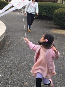 今日は風がほとんどなく、凧がなかなか上がりません。子ども達は50mの坂道を全力で下ったりして凧に風を送っていました。あした風が吹いたら直ぐに上がるね。