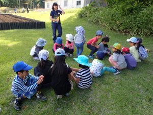 学生達にとっては芋の畝への水やりが一つ日課として増えた次第です。でも子ども達がやってきて、大きくなった芋の苗を見て驚くことを考えれば、5分もかからない水やりも楽しいかも。苗の植え付けの後は、おきまりの芝滑りでした。さっき植えた苗を思い出すのは焼き芋パーティーの時かしら。