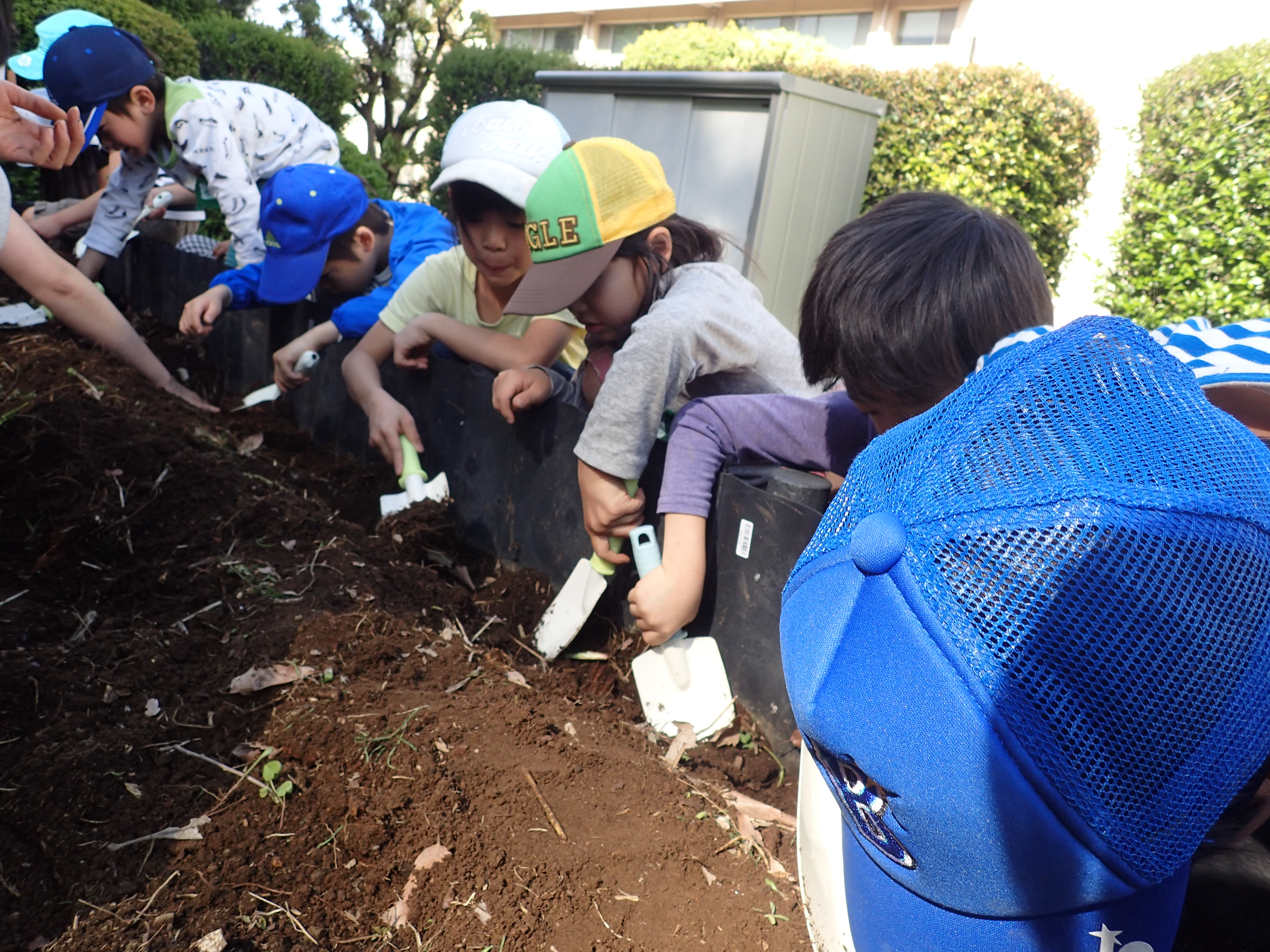 5月12日(土)に第3回目の森のようちえんが実施されました。今日は秋に収穫する芋はどうやって大きくなるのだろうということで、芋の苗を植え付けました。安納芋と紅はるかの2種類の苗を植えました。草ボウボウの畑の草取りから始まって、小さなスコップで畝を作って・・・長い時間がかかりました。芋できるかな・・・?半年先の事は想像できませんが、此所はいろいろな小動物とイノシシも出没するところなので・・・