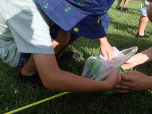 残暑の中の森のようちえんは、蚊がいっぱい!1秒でも止まっていると足元に蚊が群がっています。芝の上は野ウサギの糞があったり蚊が飛んだり、上を見るとトンボの大群が飛んでいたりと大賑わいです。バッタも捕りたいし、水遊びもしたいし、と子ども達は大わらわです。空が高く暑かった夏ももう終わりかな?ことしの夏は水遊びを3回もしました。今日は久々に飛んでいるトンボを捕まえました。腕の力も強くなるね。トンボも子ども達にちょうど捕まらない高さを飛んでいて、子ども達の捕虫網を振り回す腕力を鍛えてくれているようでした。次回は蚊と闘って竹を切り出して、竹ぽっくりを作ろう、ということになりました。楽しそうだね!