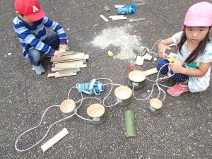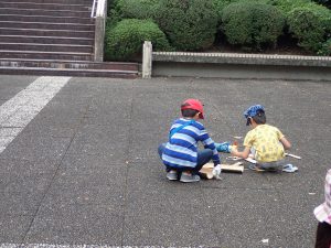 今日は竹ぽっくりで遊びました。筍を採った竹山で竹を一杯伐って、竹のぽっくりを作りました。竹藪の中は蚊が異常にたくさんいたので、学生が蚊と闘いながら竹を切り出しました。右足と右手、左足と左手を一緒に動かさないと竹ぽっくりで歩くことはできないので、何か不思議な感じでした。コンクリートや石やレンガの上で、竹ぽっくりはコンコンといい音がして進みました。階段を上ったり降りたり、飛んだりといろんな遊び方を覚えて楽しい一時でした。次回はチップを作って燻製作りです。蚊がいなくなる頃なので森の中も散策できるね。