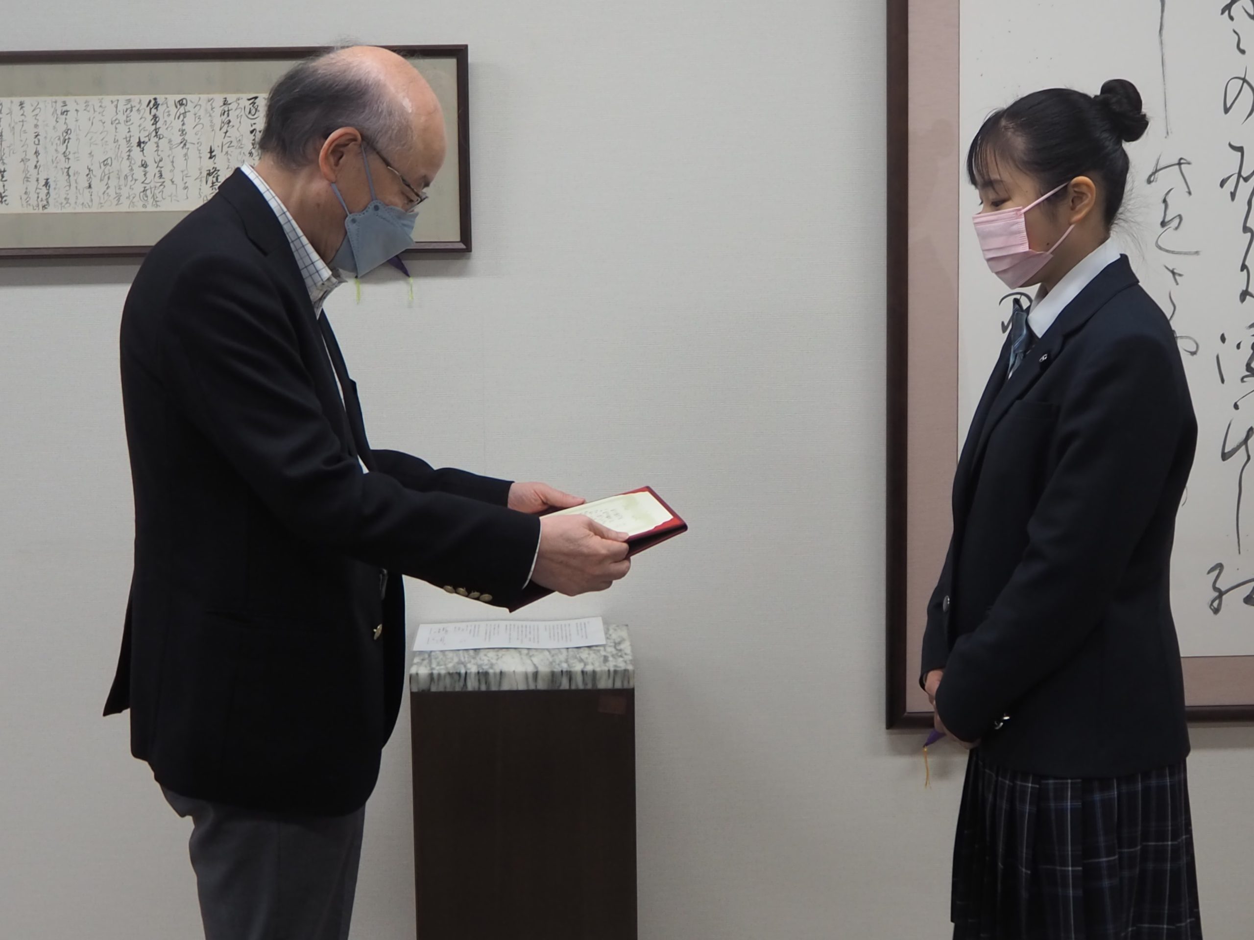 令和4年11月7日(月)、千代田三番町キャンパス理事長室にて、東京家政学院高等学校3年生の砂川さんへの賞状授与式が執り行われました。