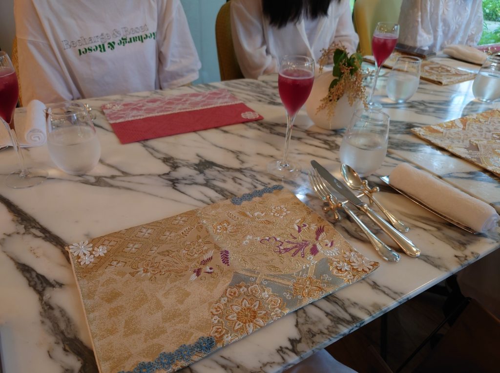 現在、8月の都内某所でのイベント開催に向けて準備をしています。イベントでは、SDGsに配慮した東京産野菜を使ったアフタヌーンティの販売、帯をリメイクして制作したティーマットを用いたテーブルセッティング体験を予定しています。