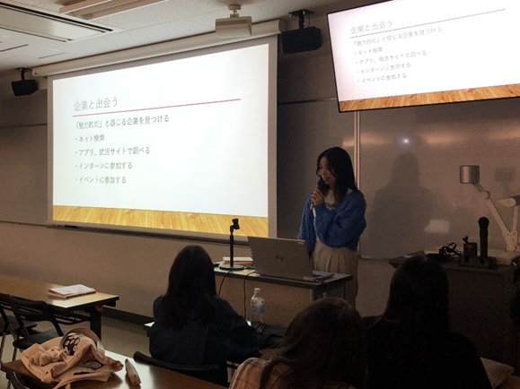 10月19日(木)に、主に3年生を対象とした就職懇談会が行われました。ファッション、金融、人材派遣、運輸など各方面の企業に就職が内定している4年生4人が、それぞれの就職活動の体験談を披露しました。大学のキャリア支援室活用のアドバイス、就職の軸を持つことや自分自身が納得できる企業を選ぶことの大切さなどの内容に、下級生たちは熱心に耳を傾けていました。全体に対する話の後、個別に4年生と下級生が懇談する時間が持たれ、より具体的に深めていたようです。感想として「就職活動をこれから始める身としてとても勉強になった」との声が聞かれました。来月には家庭科の教員に内定した4年生による会も予定しています。