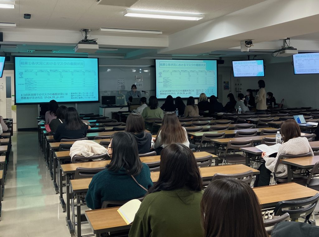 C会場では総合家政領域とハウジング領域の発表が行われました。教育、家庭に関する研究やウォーキングと体重との関係など社会や体に関する問題をテーマにした研究やまちづくりや空き家活用、コロナ禍で問題となった大学講義室の換気をテーマにした研究、さらにコロナ禍を経て人々の活動が盛んとなった今必要なホテルの提案等が発表されました。