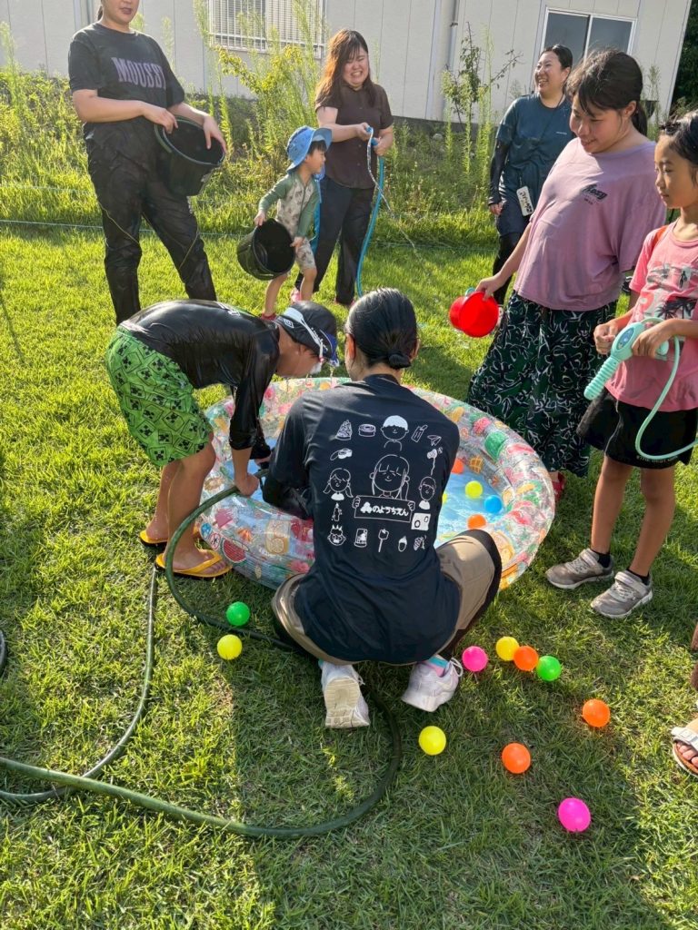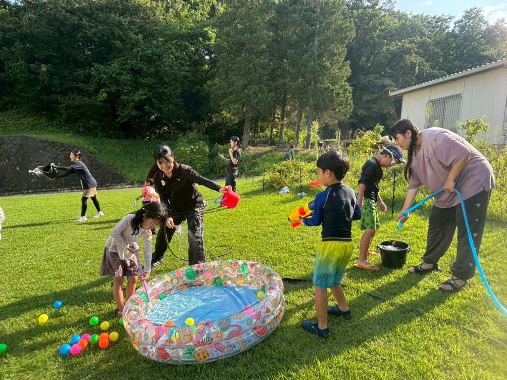 水遊びでは、水鉄砲やホース、バケツなどを使用し、みんなで楽しむことができました。
