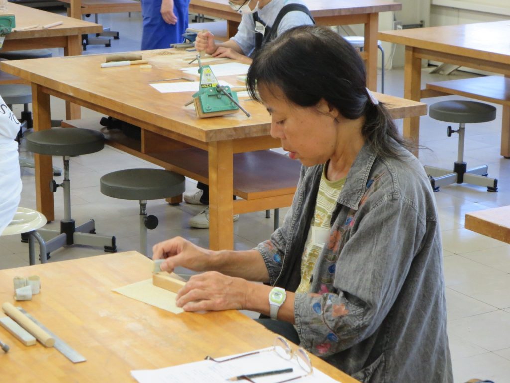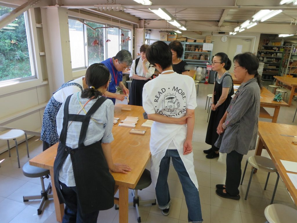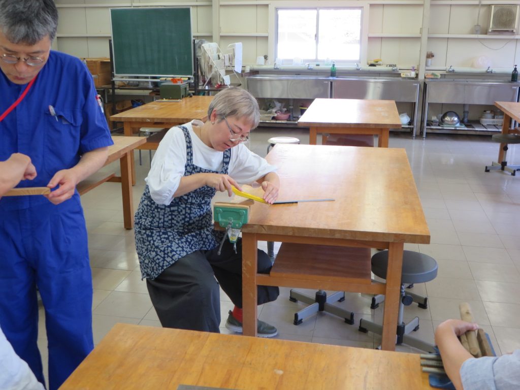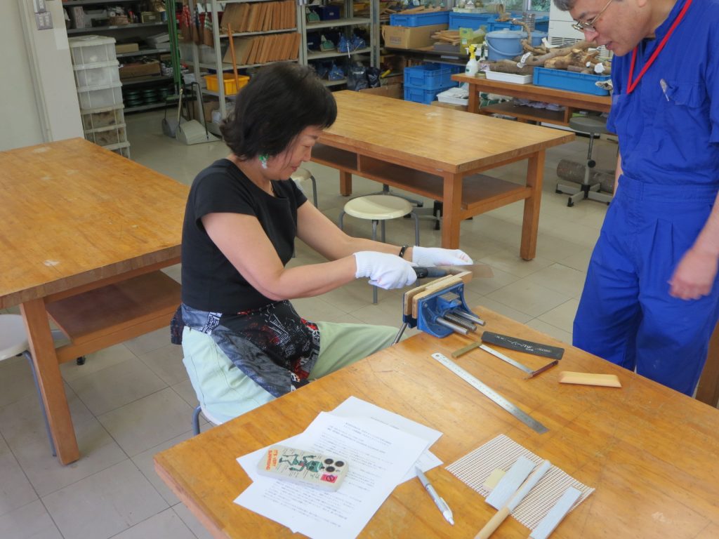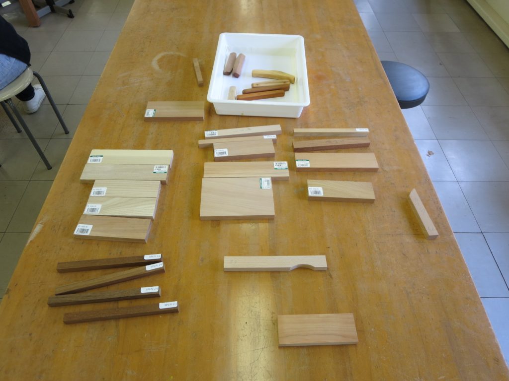 本講座は、陶芸作品制作や木の食器具制作などの研究している教員による講座。工作工房を会場に、教員が厳選した様々な木の端材を利用して、制作しました。