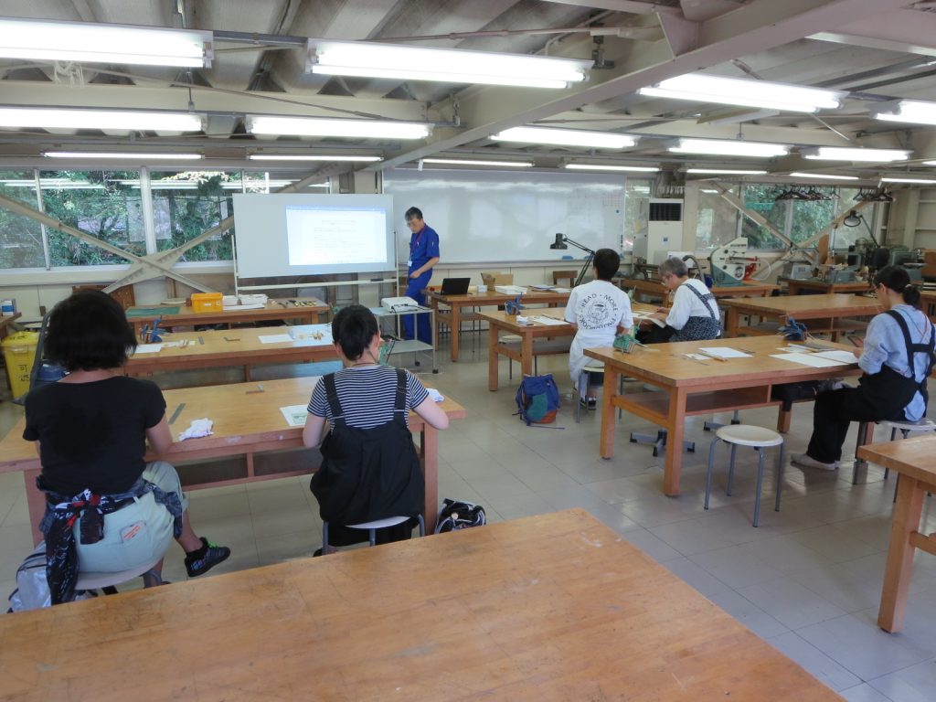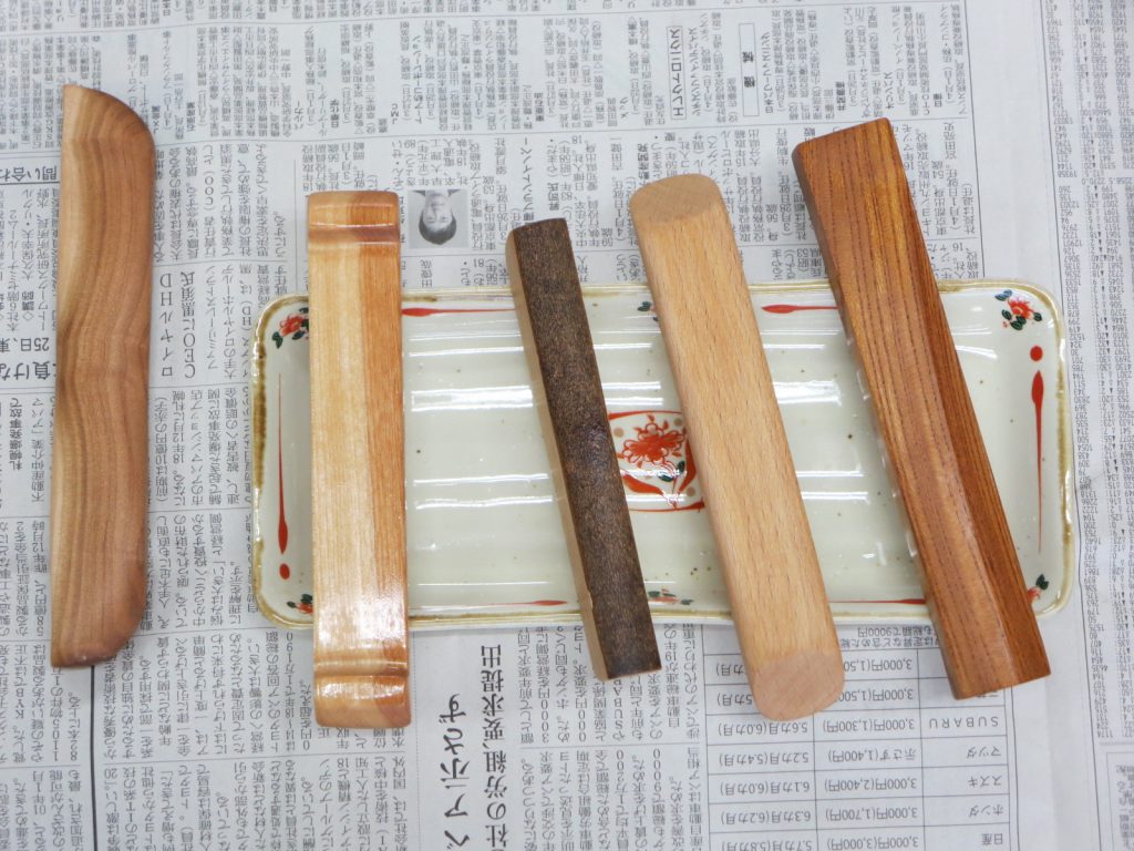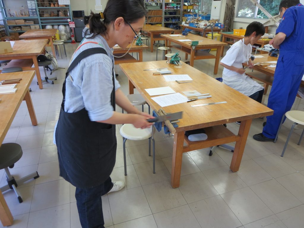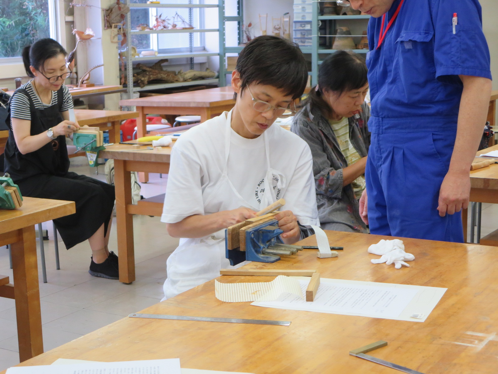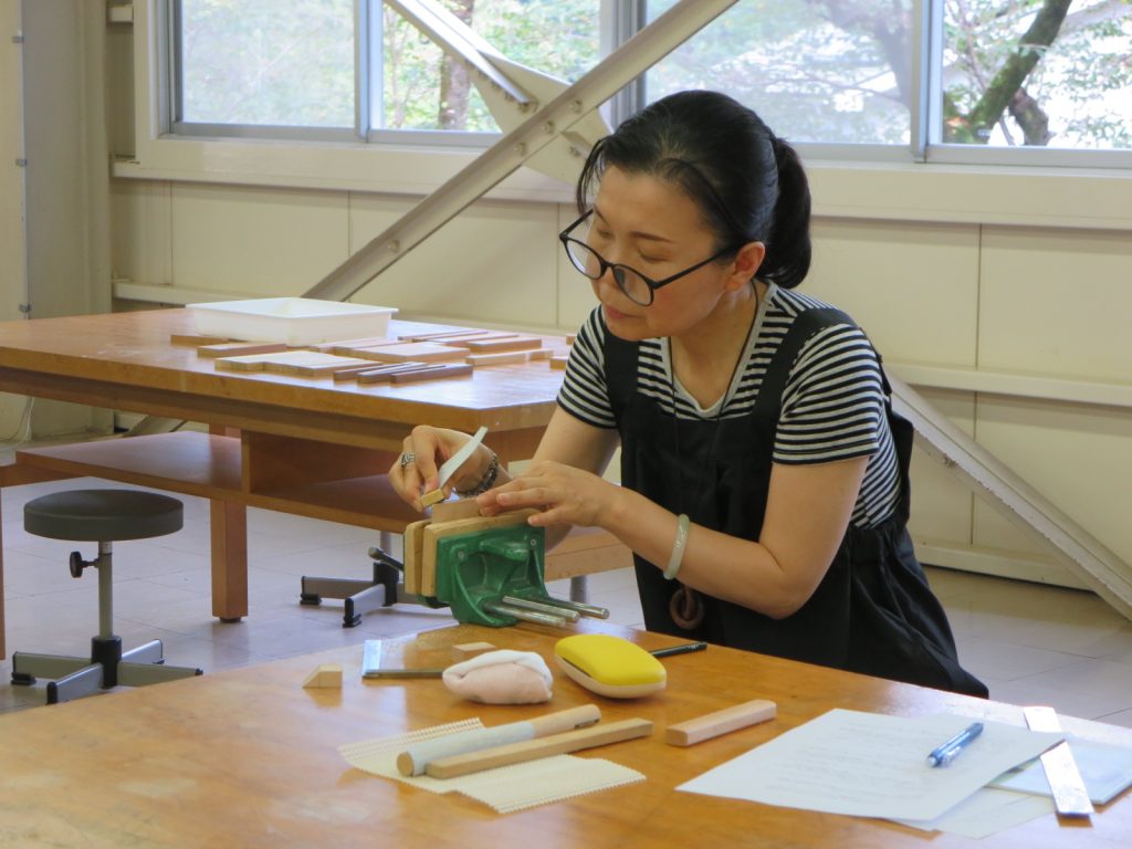 本講座は、陶芸作品制作や木の食器具制作などの研究している教員による講座。工作工房を会場に、教員が厳選した様々な木の端材を利用して、制作しました。