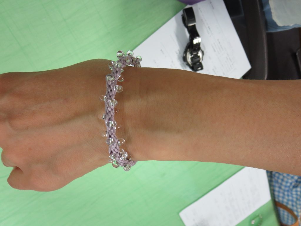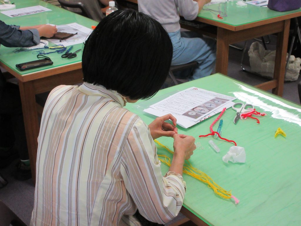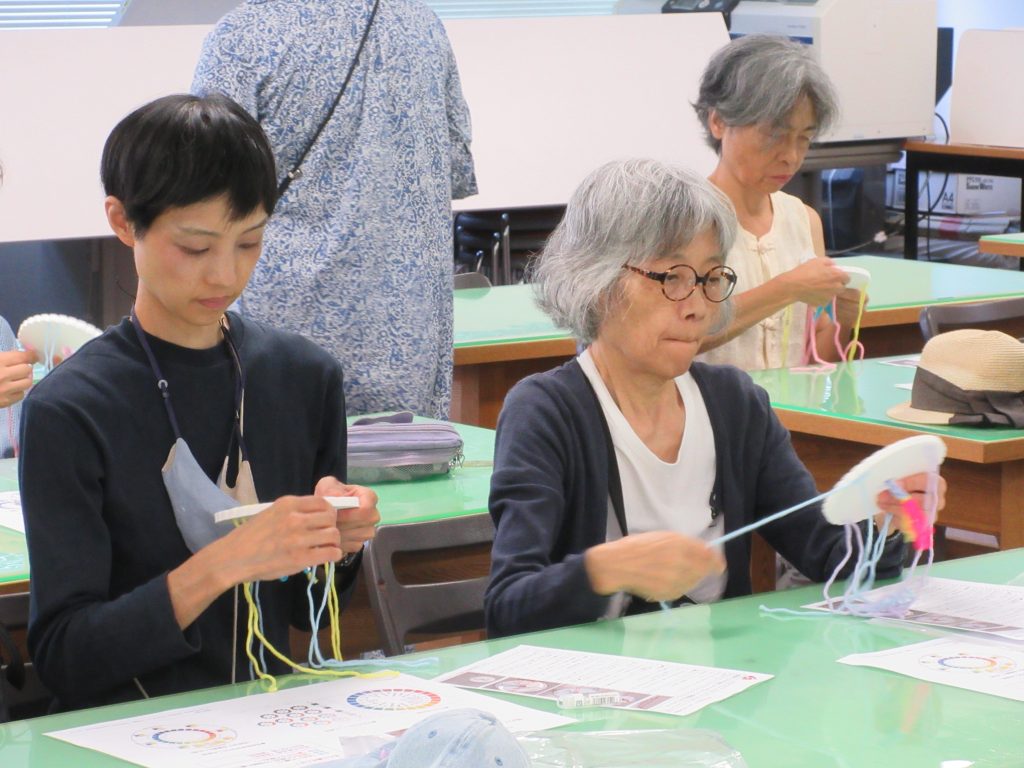 当日は、色や組紐について学んだ後、ブレスレット制作で使用する組紐ディスクの使い方を指導されながら、10代から70代以上の参加者が制作に取り組みました。
