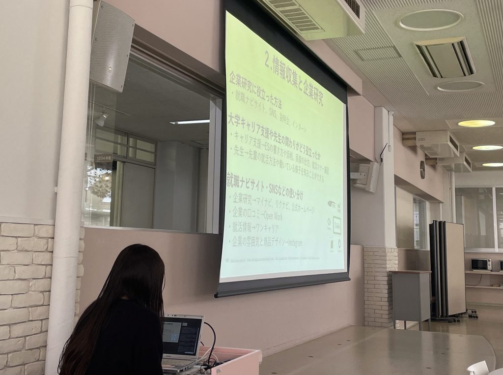今回は、4年生の内定者4名を講師としてお迎えし、就職活動の流れや具体的な心構え、企業研究の進め方などについてお話しいただきました。