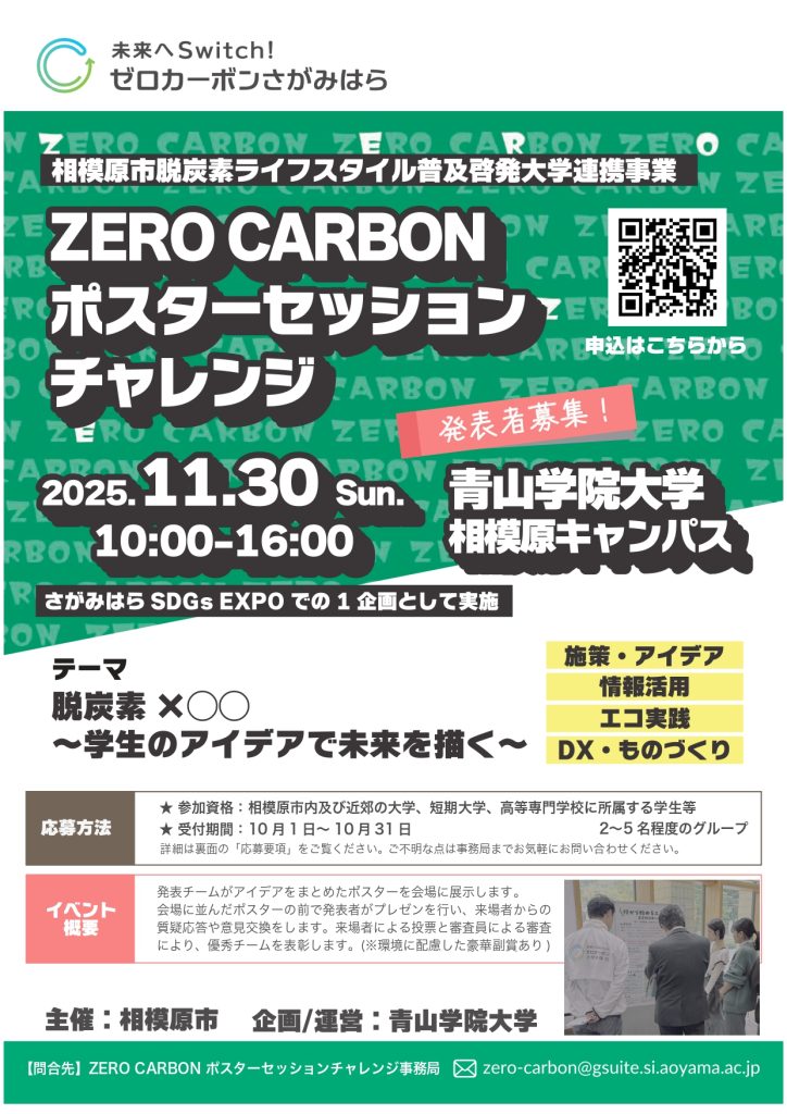 様々行われた企画のうち、いろいろな観点から従来の発送にとらわれない脱炭素に資するアイデアを提案し、その成果をポスターセッション形式で発表する「相模原市 脱炭素ライフスタイル普及啓発大学連携事業『ZERO CARBONポスターセッションチャレンジ』」に、住環境を学ぶ生活デザイン学科4年生が出展しました。