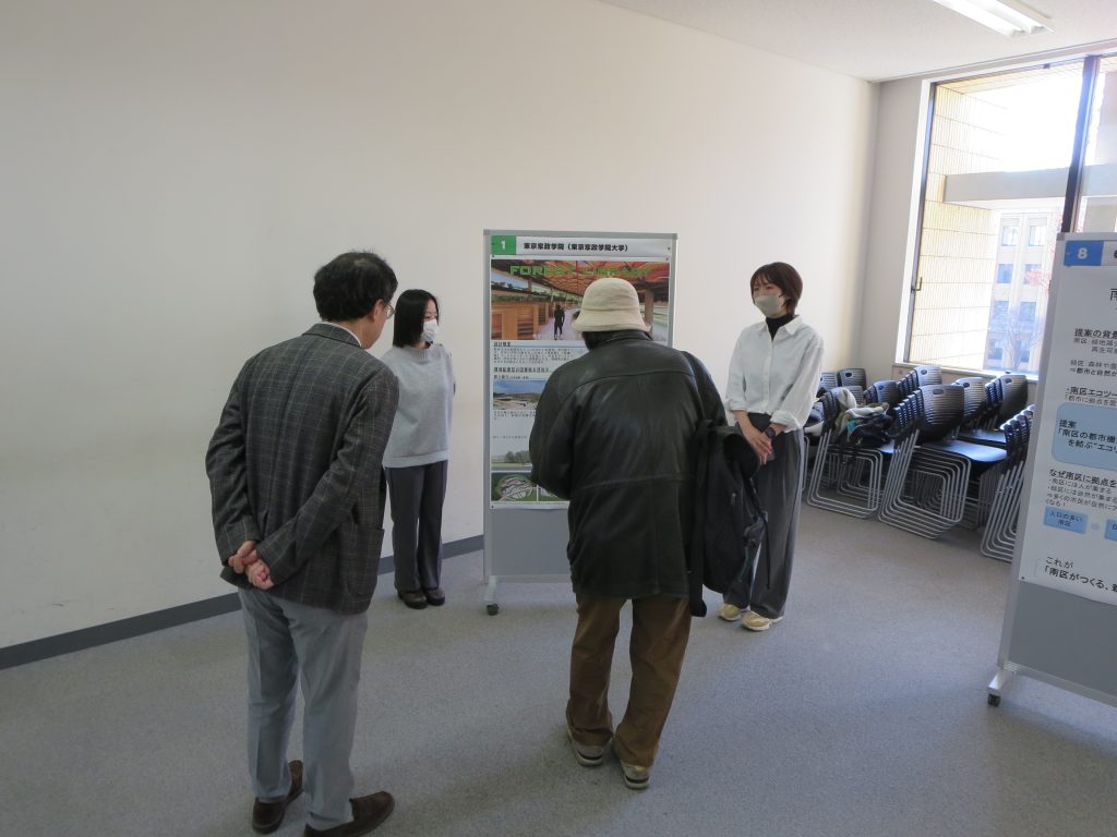 ポスターセッション会場には、本学を含め13団体の大学が出展。他大学では実際に活動している内容などを発表していた中で、本学は異彩を放っていたようで、審査員も一般の方も足を止め、学生の説明を聞き、また、質疑応答をするなど、大変興味を示されていました。