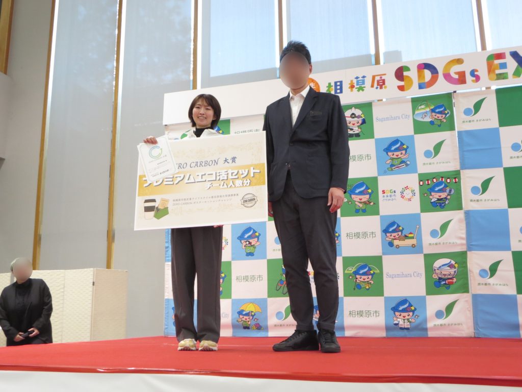 その結果、審査結果発表では、なんと最高位となる「ZERO CARBON賞」が贈呈されました。最後の最後で大学名が呼ばれ、若干諦めかけていた学生は驚きを隠せないまま登壇しましたが、他大学学生・関係者・一般の方が見守る中、堂々と授与のスピーチをされていました。