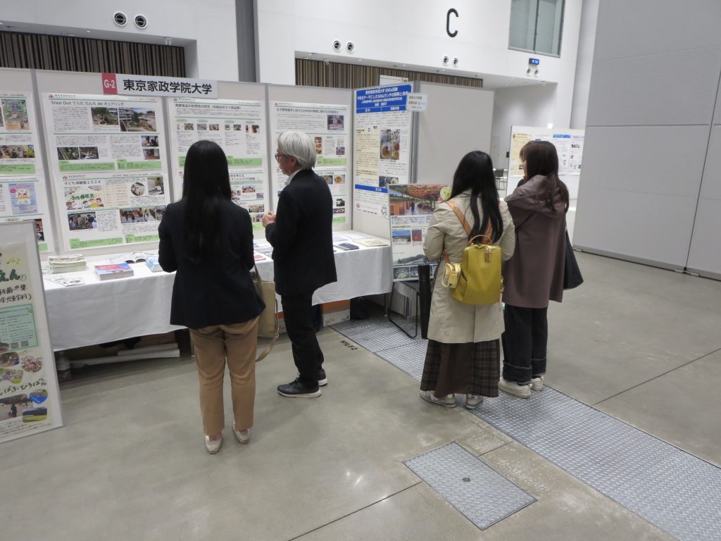 大学名に「家政」と入っていることで、素通りしてしまう方もいましたが、ブースを埋め尽くすように展示した事例ポスターの多さに足を止める方も多くいました。ブースでは、展示ポスターの紹介だけではなく、平置きした地域連携活動報告書に基づく、他の事例紹介も行うなど、本学ができる連携などを説明し、アピールに務めました。