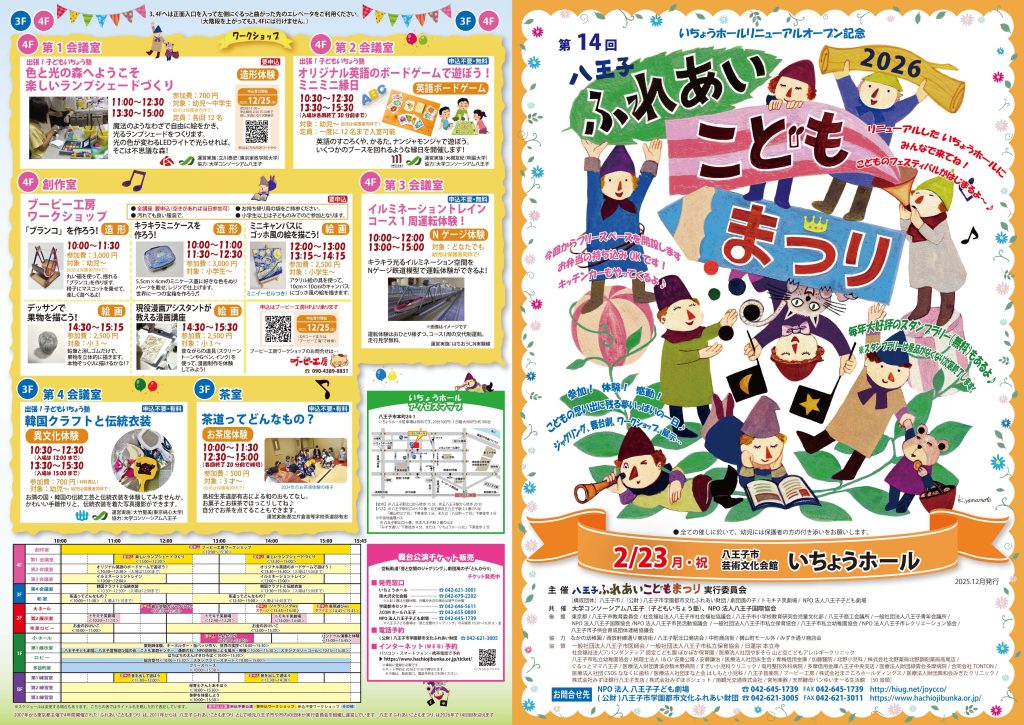 令和8年2月23日(月・祝)、八王子市に在住または在学する小学生を対象とした「第14回2026八王子ふれあいこどもまつり」(八王子ふれあいこどもまつり実行委員会主催)がいちょうホールにて開催されます。本学からは生活共創学部こども教育学科の立川泰史教授と学生が参加します。