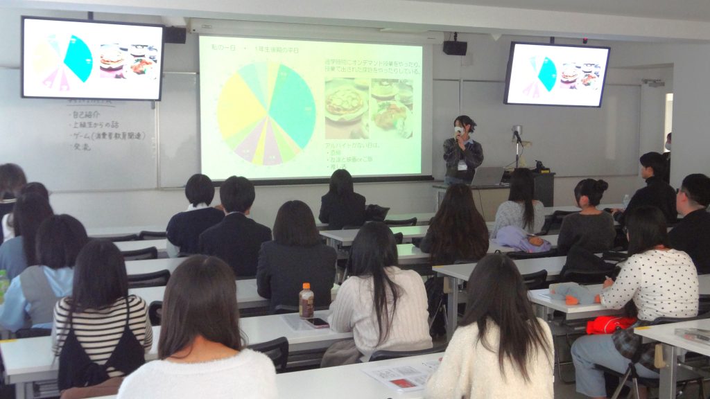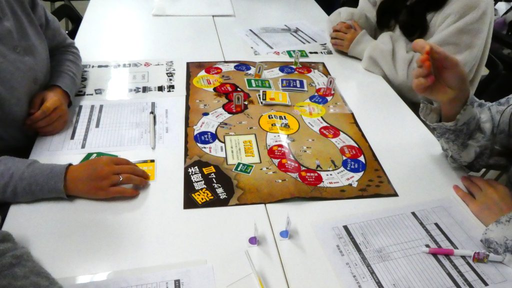 千代田三番町キャンパスでは、現代家政学科の年内入試の入学予定者を対象として実施しました。鷹野景子学長によるあいさつののち、前半は町田キャンパスと同様の全体会を実施し、後半の分科会では参加者の自己紹介、学生スタッフの上級生による学生生活の紹介のあと、消費者教育のボードゲームに取り組みました。サイコロを振って出た目や、引いたカードに書かれた指示に一喜一憂しながら、楽しいひとときを過ごしました。ゲームを通じて参加者どうし互いに打ち解けあうことができたようです。