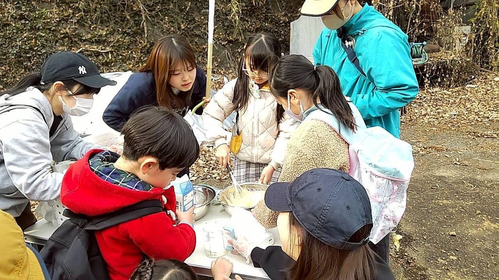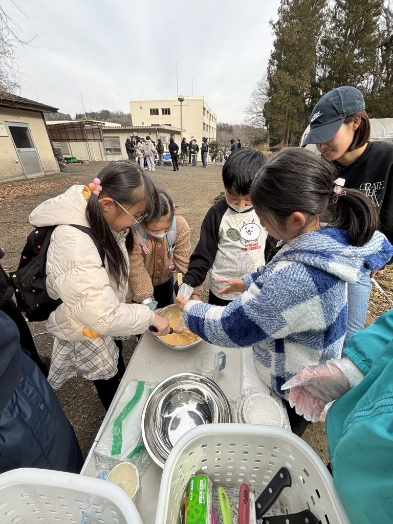 友だちと協力しながら順番に混ぜ、「いいにおいがしてきた!」「早く焼きたいね!」と楽しそうな声も聞こえてきました。
