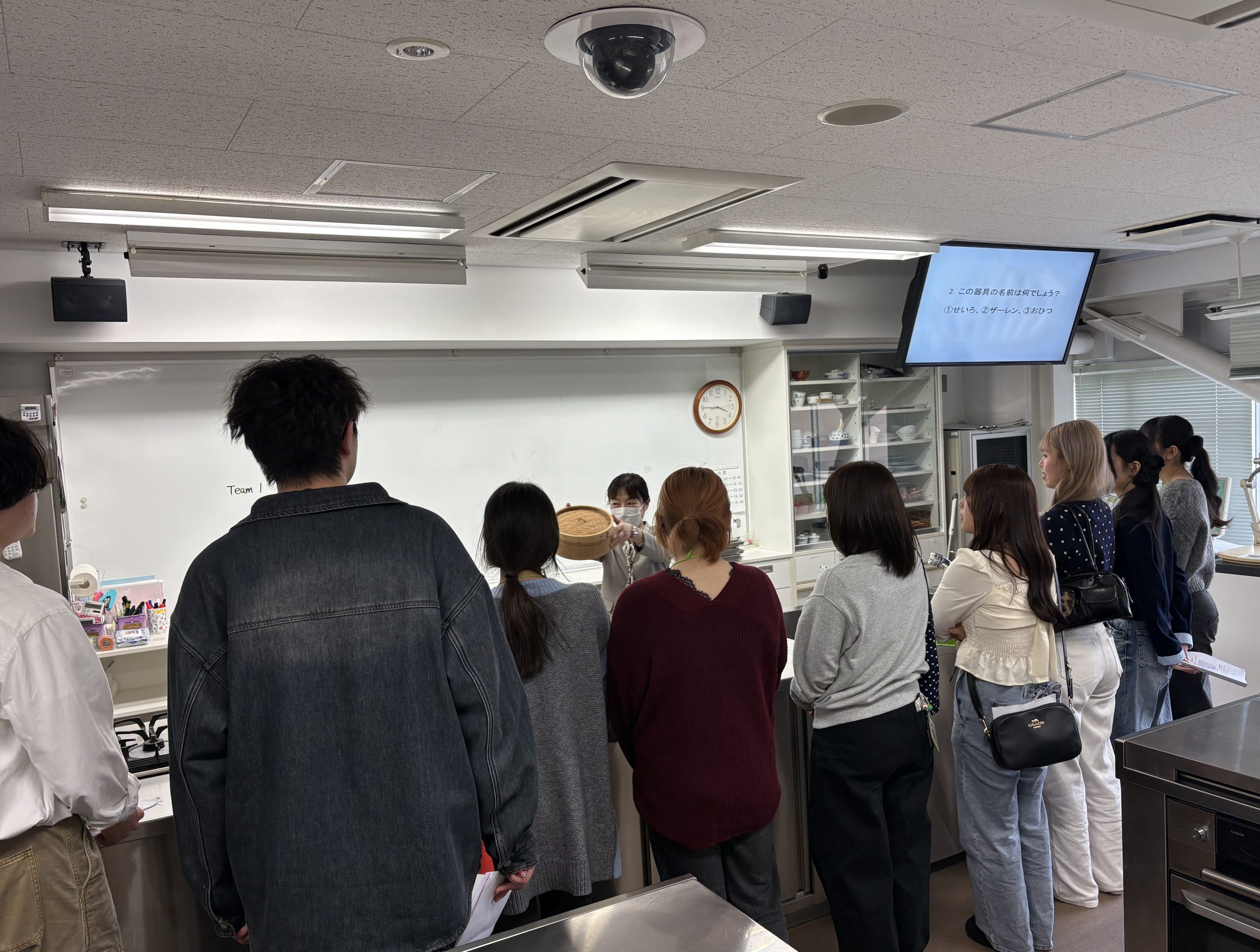 1406実習室 では、竹中先生と青柳先生による「調理実習室クイズ」にチームで取り組み、食材や調理器具の名称当てなどに挑戦しました。
