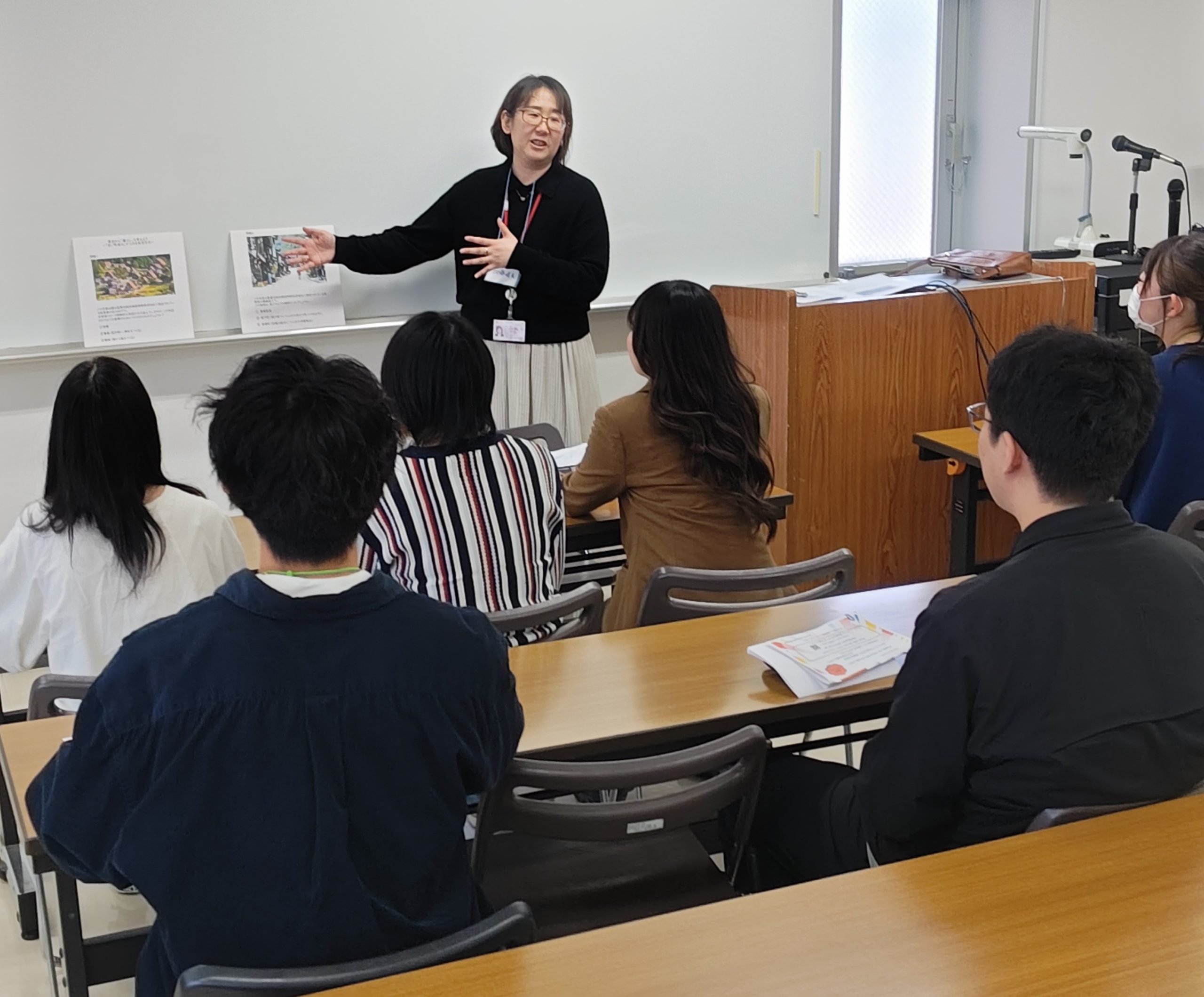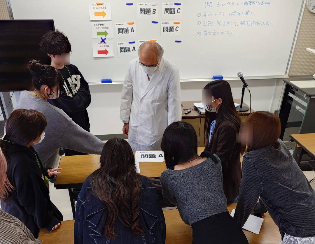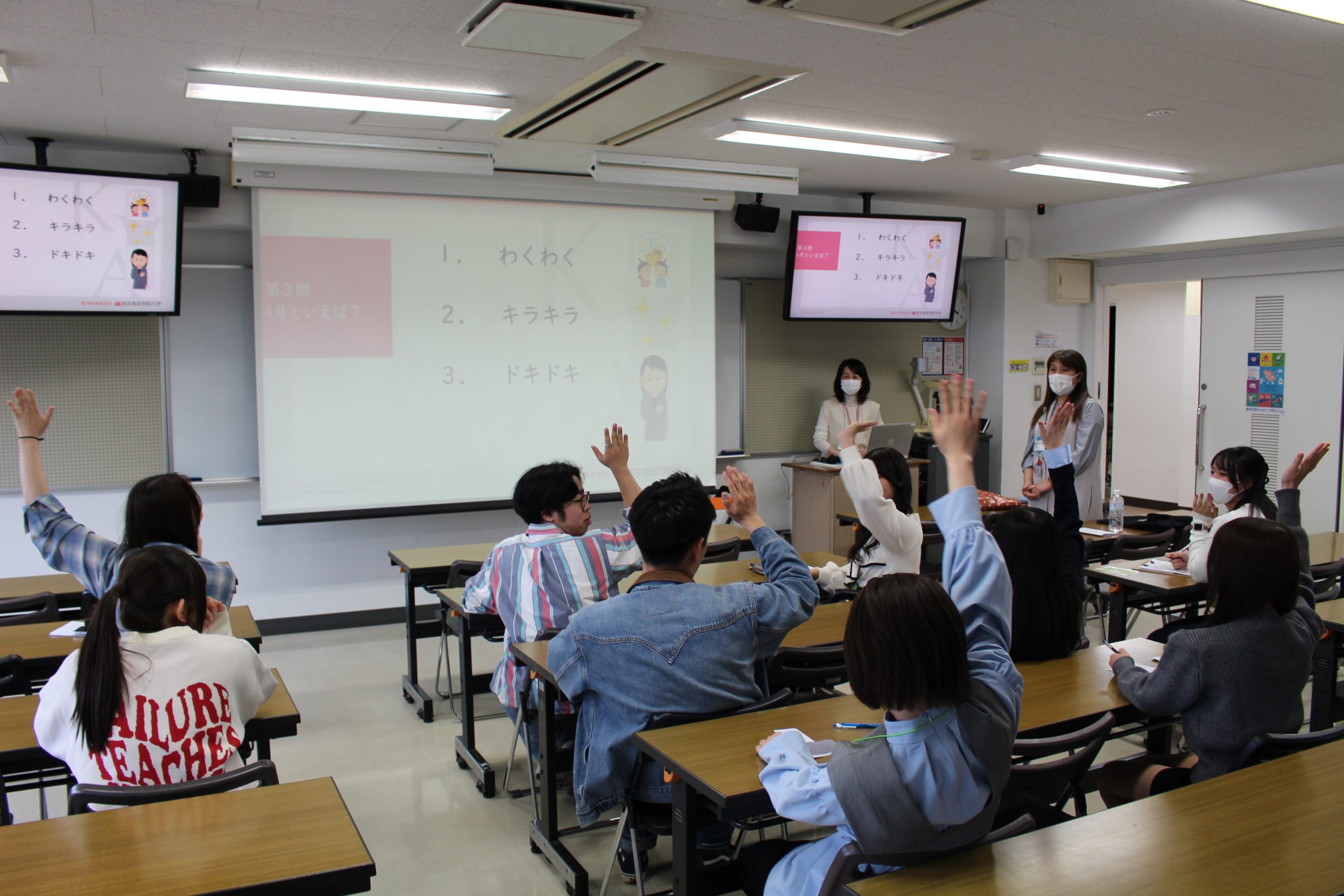 この他1508教室では、「東京家政学院・大江スミ先生クイズ-大学を知ろう」と題したクイズを行い、建学の精神や本学の沿革、創立者である大江スミ先生について学ぶ良い機会となりました。また、附属図書館では、内田先生と北見先生による図書館の概要や利用法に関するクイズもありました。