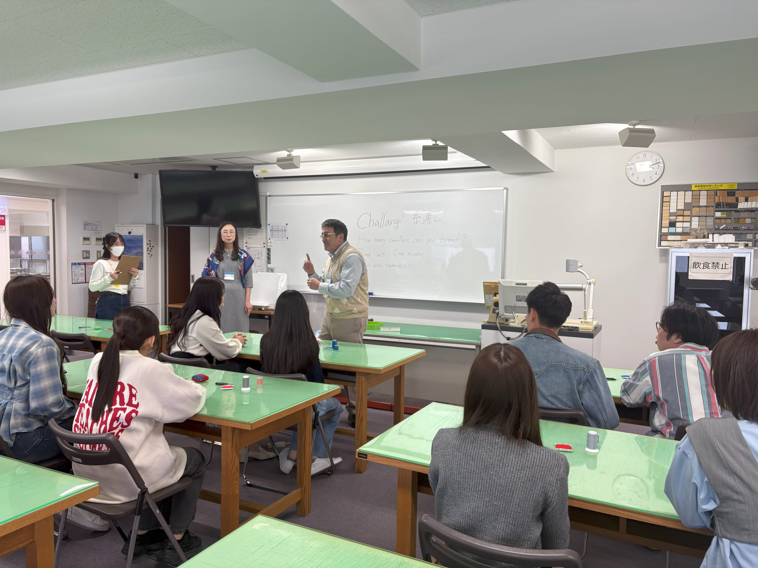 1708実習室では、山村先生、太田先生、ルイス先生による「Challenge糸通し」が行われ、ペアで協力して制限時間1分以内にどの位糸通しができるかに挑戦しました。