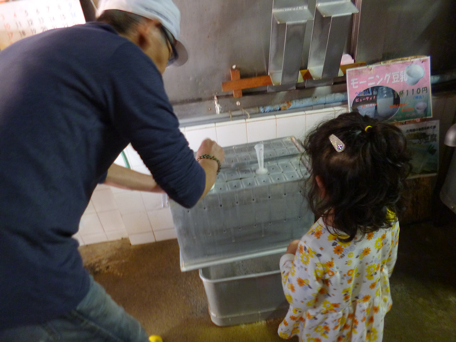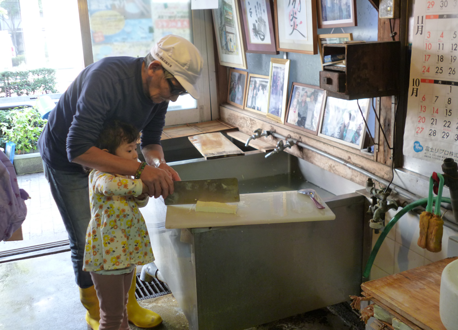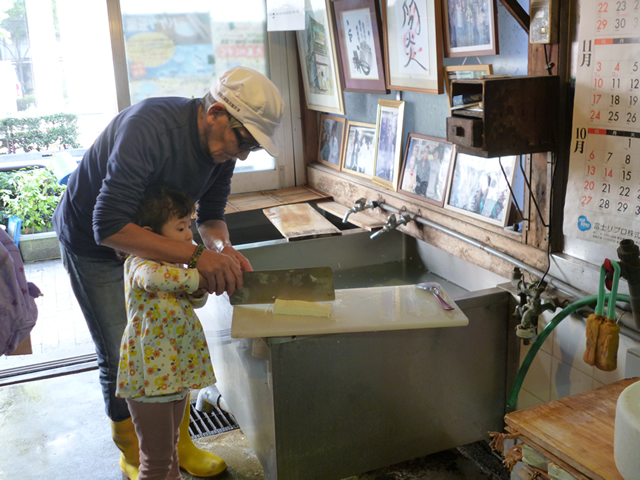 最初は豆腐専用の大きな包丁に怖がっていたお子さんでしたが、お店の方に「これはね、お豆腐だけしか切れないんだよ。手は切れないから大丈夫、やってごらん」と優しく教えていだき、恐る恐る包丁を握っていました…何度か店主さんと一緒に切ってみると、コツがわかったようでその後は一人でも切れるように!まっすぐ切ることに苦戦していたようでしたが、とっても楽しそうでした。