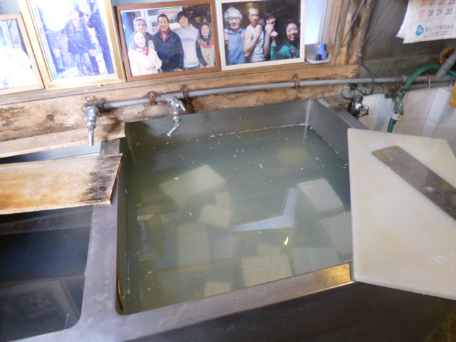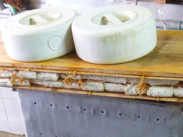 こちらは焼きあがった豆腐を重石で水切りをしている様子です。このようにして、煮崩れにも強いしっかりとした焼き豆腐が出来上がっていくのですね。