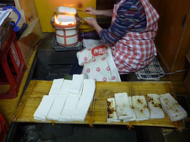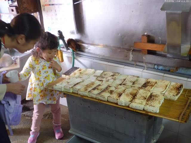 越後屋さんでは自家製のお豆腐を炭火で炙った焼き豆腐も販売しています。実際に奥さんが焼き豆腐を作っている様子を見させていただきました!真っ白なお豆腐がパチパチと心地よい音を立てながら焼かれ、焼き豆腐へと変身していく様子にお子さんも興味深々!「ぼやぼやしてたら真っ黒こげになっちゃうのよ。」という奥さんの言葉にお子さんもニコニコ…何度も何度も焼き場の前に行き、名残惜しそうにその場を離れる様子からは、真剣でもあり、楽しそうでもある、そんな学びの表情がみられました。あたりに漂う豆腐が焼ける香ばしい香りに、そこにいたみんなが食欲を刺激されてしまいました…