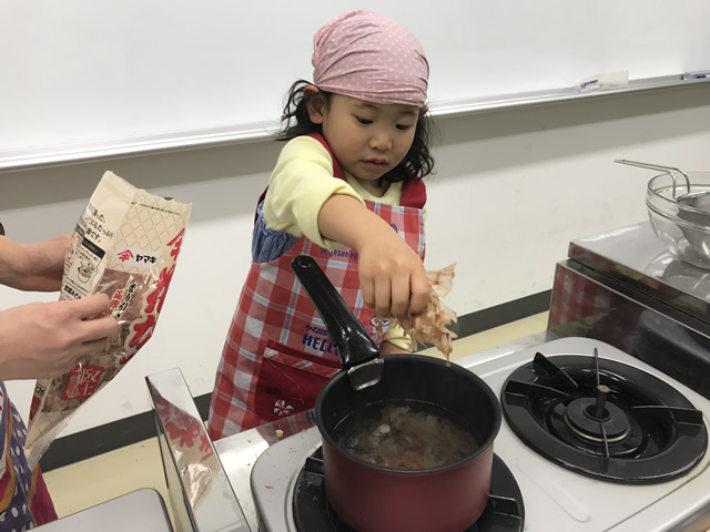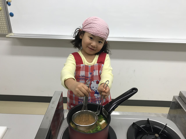 天野屋さんで買ってきたおみそと、越後屋さんで頂いたお豆腐で初めておみそ汁を作ります。まずはお湯を沸かして、かつお節からお出しをとりました。お子さんはかつお節からお出しをとったのが初めてで、かつお節を鍋に入れてしばらくして取り出すことを不思議に思っている様子でした。次にお豆腐をサイコロの形に切り(さいの目切り)火が通ったら、一度火を止めておみそをみそこしきで少しずつ溶かしながら入れました。もう一度火を入れて、温めてみそ汁をお椀に盛り付けました。