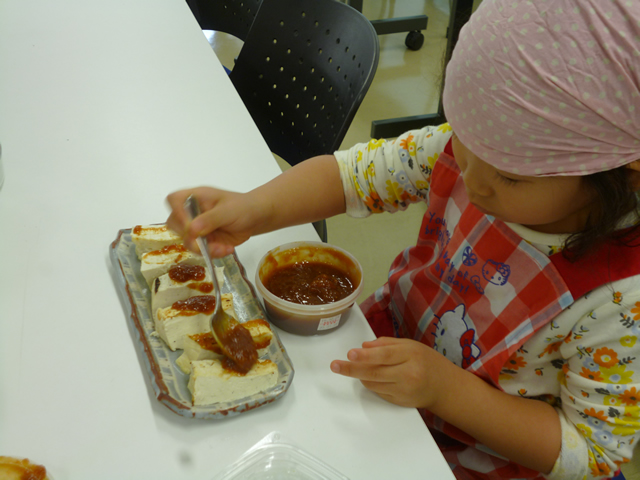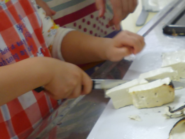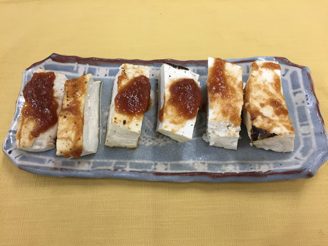 初めに越後屋さんで頂いた焼き豆腐を食べやすい大きさに切り、次にお皿に移しレンジで温めました。温めたお豆腐に田楽みそをつけて完成です。お子さんは目の前の焼き豆腐を早く食べたくてそわそわしていました。