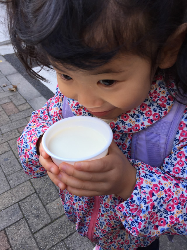 “豆腐”は前述のように、大豆から生まれ変わった豆乳に塩化マグネシウムが主成分である“にがり”を加えることで固めて作りますが、なんとお店の方のご厚意で、その体験をさせていただきました!体験したお子さんは、豆乳に“透明な液”を入れて、ぐるぐるとかき混ぜるだけで、だんだんと固まってくる様子を不思議そうにみていました。こうして見慣れた豆腐になっていくことに驚いた様子でした。小さいお子さんはもちろん、大学生の私たちでさえ豆腐を固める作業工程を体験する機会は滅多にないものです。その様子に釘付けになってしまいました!