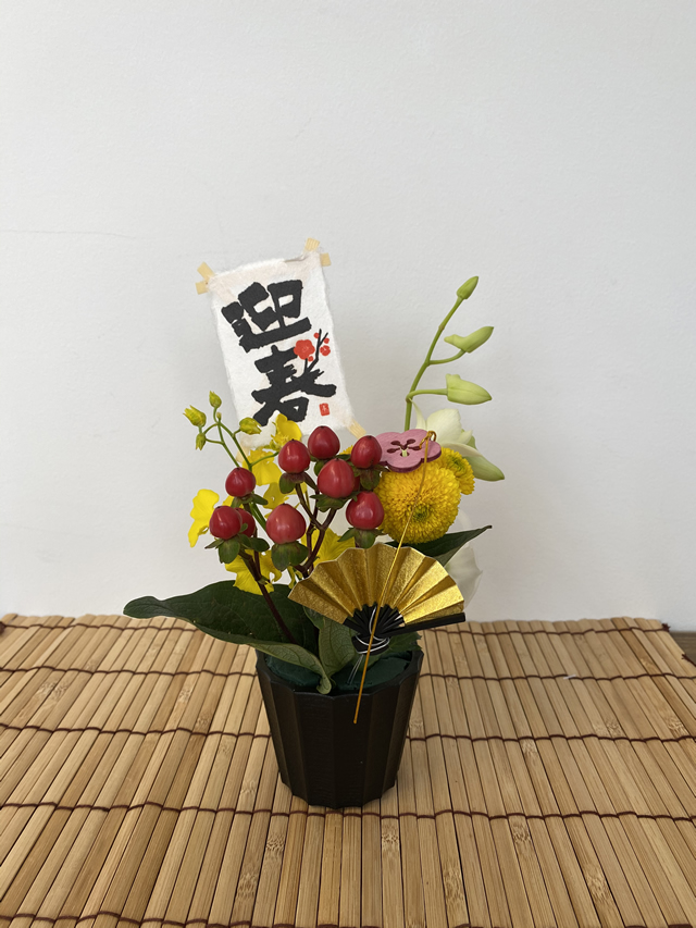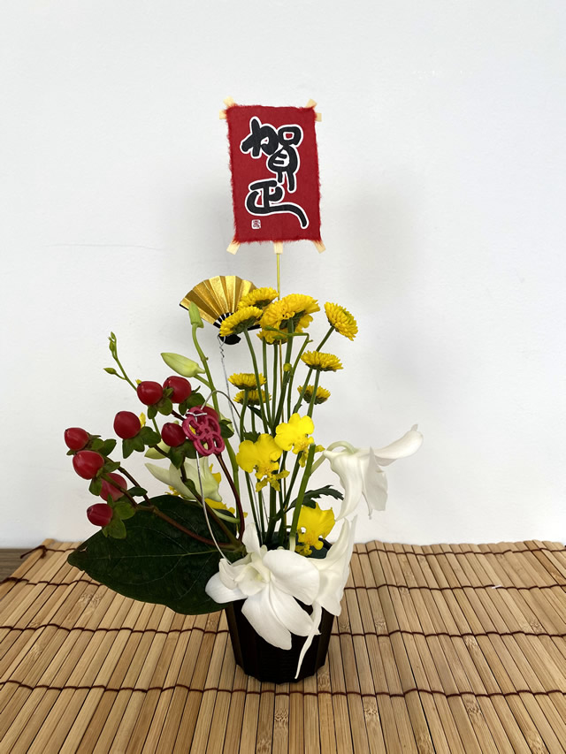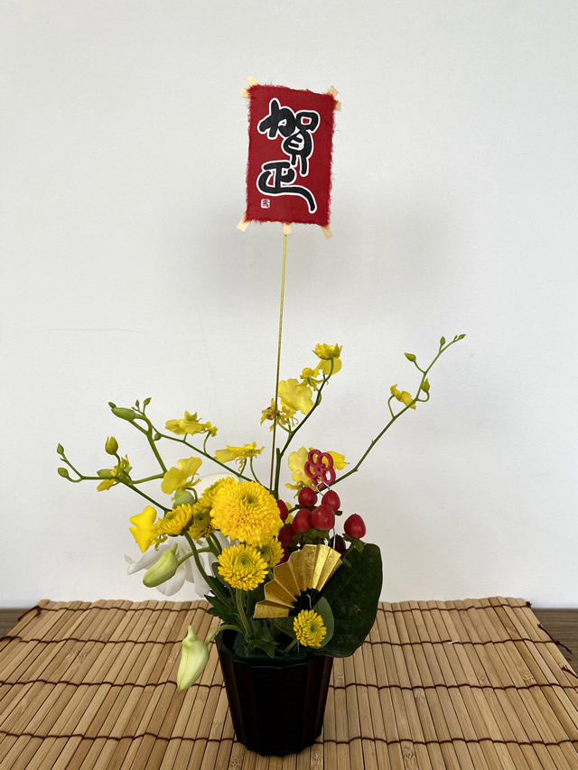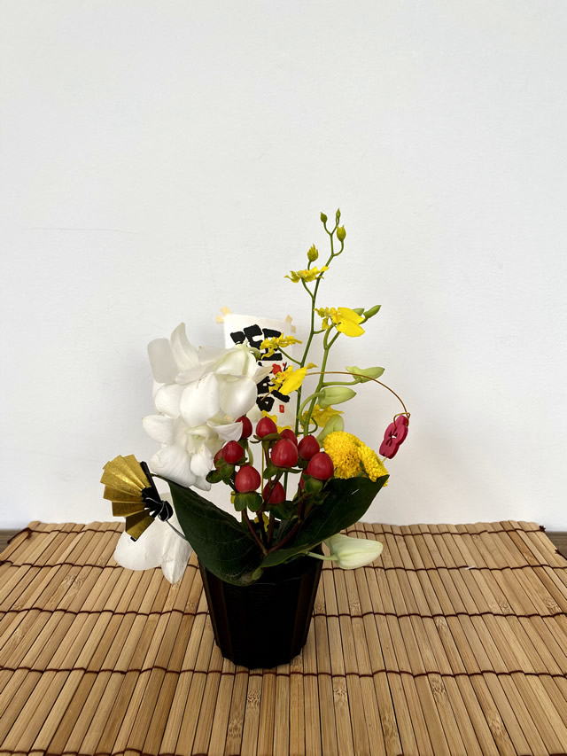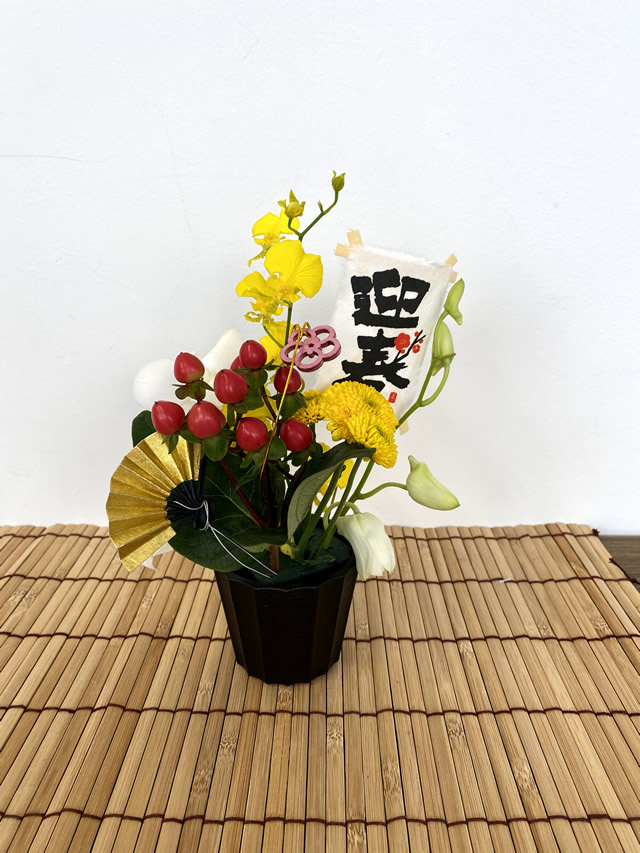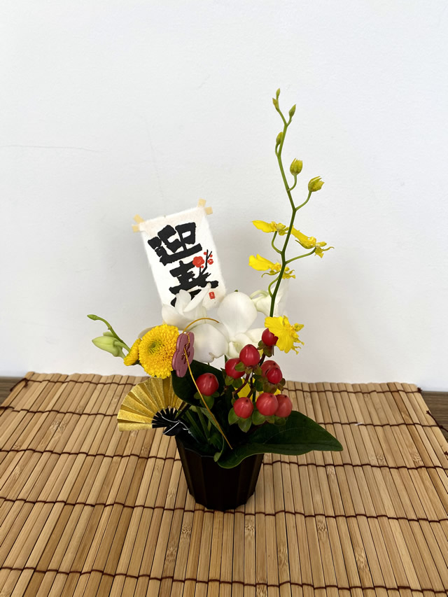 今回のアレンジメントのテーマは「お正月に飾るアレンジメントをしよう」ということで、正月らしい白と赤のフラワーピック、花の飾り物(柳をイメージ)、オンシジウム(黄色の細かいラン)、デンファレ(白のらん)、スプレーマム(小さな黄色のまんまるの真花)、ヒペリカム(赤い実)を使いアレンジメントを体験しました。