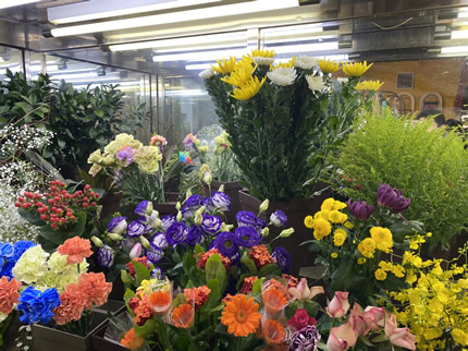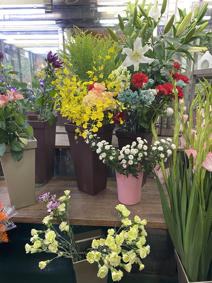 お花の流通については、市場によってそれぞれ得意分野があるため太田、葛西、世田谷の3つの市場から厳選された花を使用しています。例えば、太田市場は、全ての果物やお花が一番集まる市場です。葛西は、菊や仏花が得意です。世田谷は、切り花がメインであります。このように得意不得意があるため、様々なルートを使って花を仕入れているそうです。