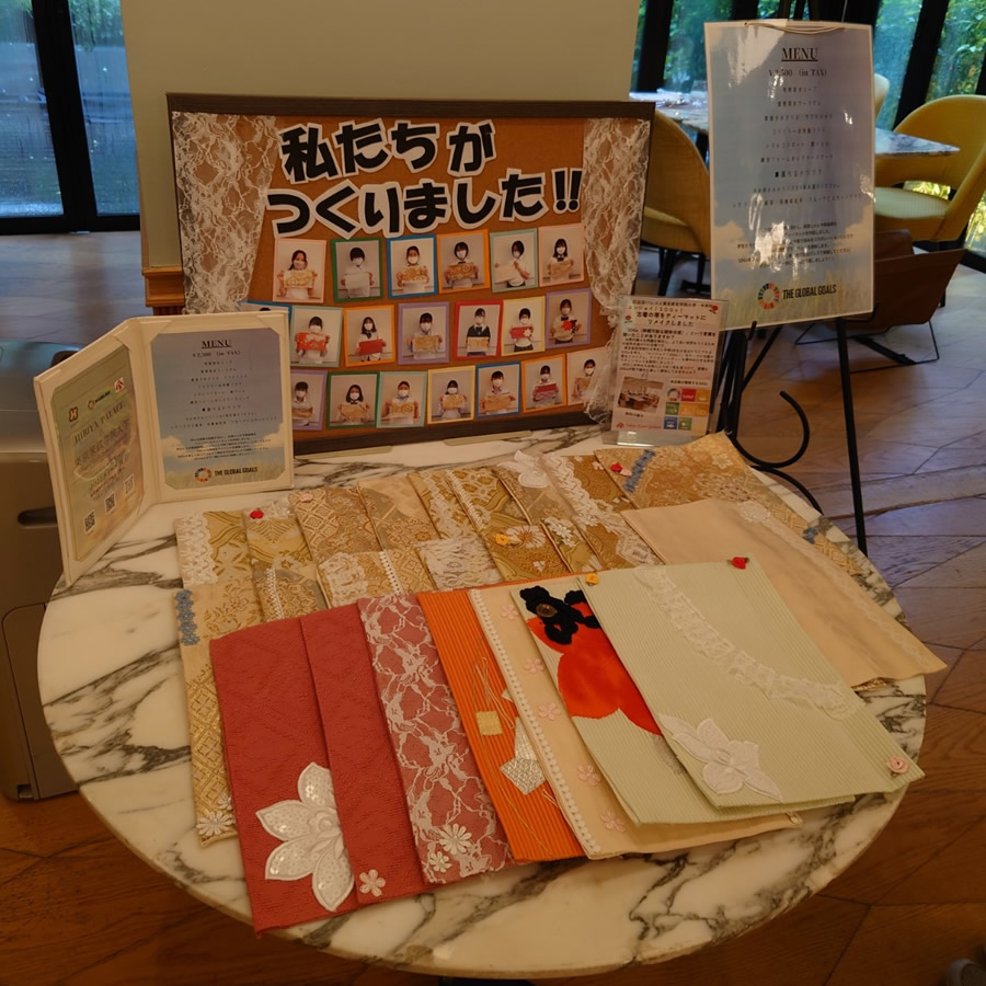中学生と作ったティーマットも会場に展示しました。さらに、イベントメニューを注文してくださったお客様には、お好きなティーマットを選んでご自分のテーブルにセッティングしていただけるサービスを提供しました。