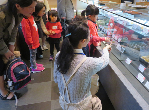 一階で和菓子などが販売されており、二階の喫食スペースでは一階で販売されている和菓子(選ぶことができます)とお茶のセットを600円(税込)でいただくことができます。今回はインタビューしながらいただくお菓子をみんなで選びました。取材日は11月だったので、子どもたちは秋らしい和菓子に囲まれて一つを選ぶのにとても悩んでいるようでした。