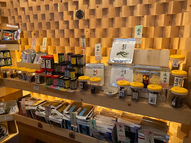 普通の海苔ももちろん、ご飯にかけるふりかけも売っています。試食もでき、様々な味が試せますよ!