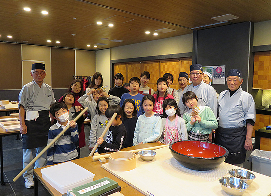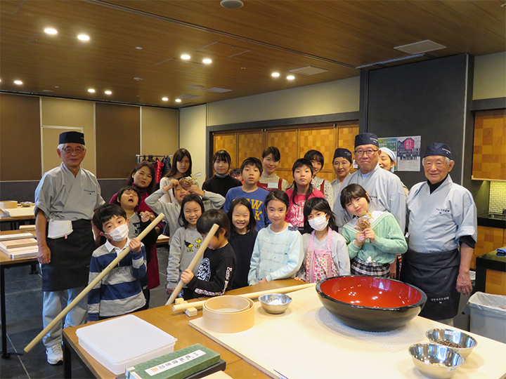 最後に全員で記念写真を撮って終了。お土産にそばを揚げたものを頂きました。お店では売っていない特別なおやつ、帰ってからもそばを楽しむことができました。子供も学生も、そばについて学びそばの魅力に触れることができた時間になりました。
