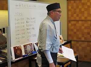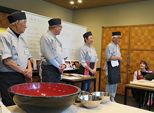 その時、神田藪そばの社長がその中の役員をやっていて、江戸のそばやそば文化を広めたいといことでそばの教室をやったらどうかとなり、そば研の方々のところに声がかかったそうです。そば打ち体験は今年で6年目で延べ1200人くらいの人がすでにここの教室に来ているとのことでした。それだけそばの文化が広まってるということが分かりました。他にもここではそば打ち体験だけではなく、そば料理の教室も行っているそうです。