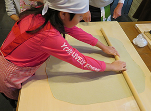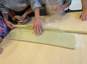 生地を延ばしていきます。みんな手を粉だらけにしながらそば打ちに夢中。全体を同じ厚さにするのが難しかったです。