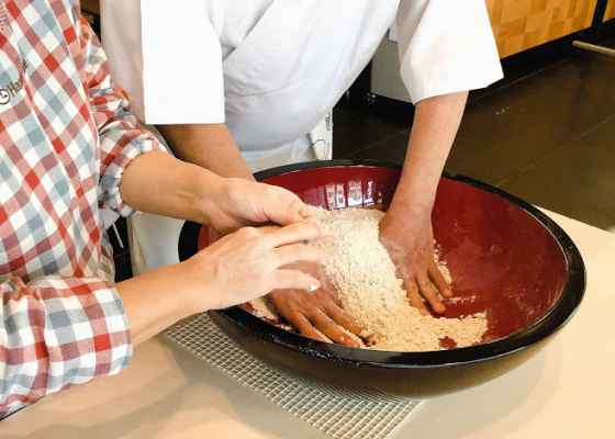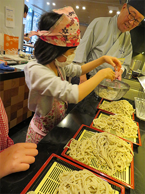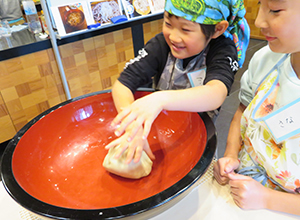 大きなボウルを使って順番に生地をこねます。よくこねることがおいしいそばができるためのコツだそうです。こねるのに力を使うため子どもたちは大変そうでした。