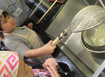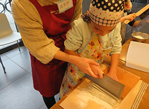 大きくて重い包丁で麺を切るときは大人に手を添えてもらって慎重に。どのグループも上手にできました。
