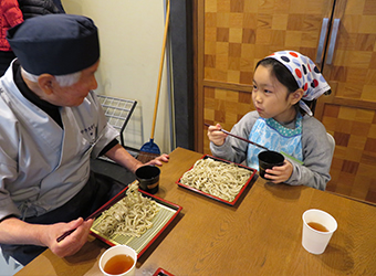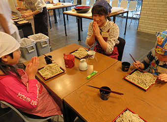 完成したそばは茹でてざるそばにして食べました。自分たちで手作りしたそばは格別な味、みんなおいしい、と嬉しそうな声。麺だけではなくそばつゆもそば湯も忘れずにじっくり味わい、そばを堪能できました。